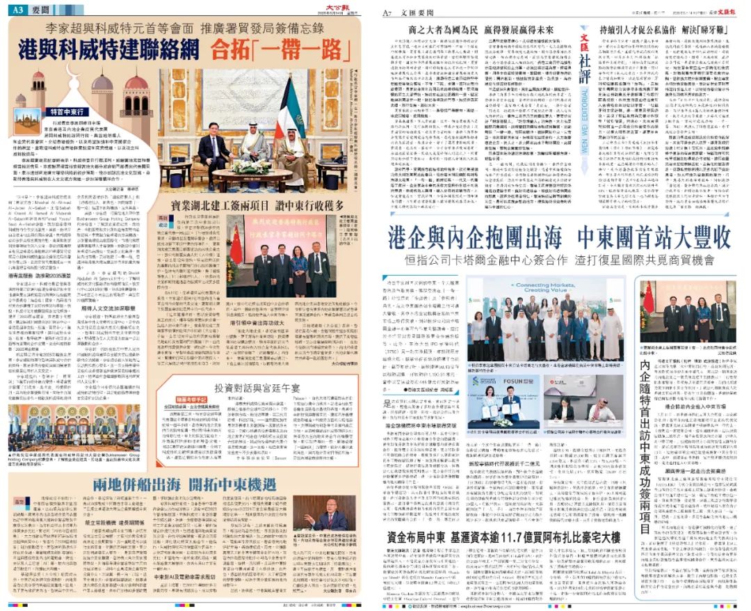 訪問期間,李家超與兩國國家元首及政要會面,就相關(guān)合作進行深入交流;代表團還考察了卡塔爾盧賽爾智慧新城、科威特自由貿(mào)易區(qū)等重點項目,與多家金融機構(gòu)對接,與兩地政商界領(lǐng)袖舉行多場圓桌會議。